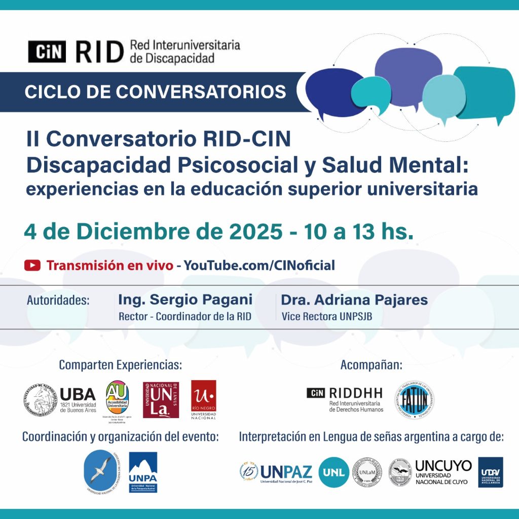 La UNPSJB, desde la Comisión Accesibilidad Universitaria, como miembro de la Red Interuniversitaria del CIN, coordinó el II Conversatorio Discapacidad Psicosocial y Salud Mental: experiencias en la educación superior universitaria, el 4 de diciembre de 2025 con transmisión por YouTube.
